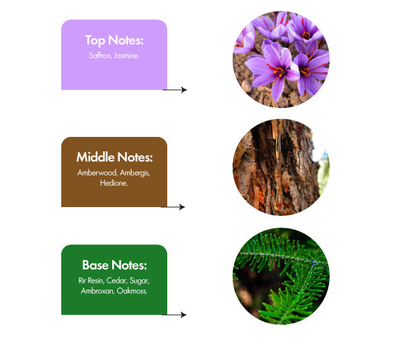 Notes: Saffron, Jasmine, Ambergris, Cedarwood, Amberwood, Musk, Fir Balsam