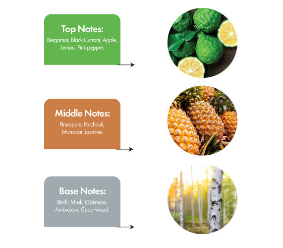 Notes: Bergamot, Blackcurrant, Apple, Pineapple, Rose, Jasmine, Birch, Oakmoss, Ambergris, Vanilla