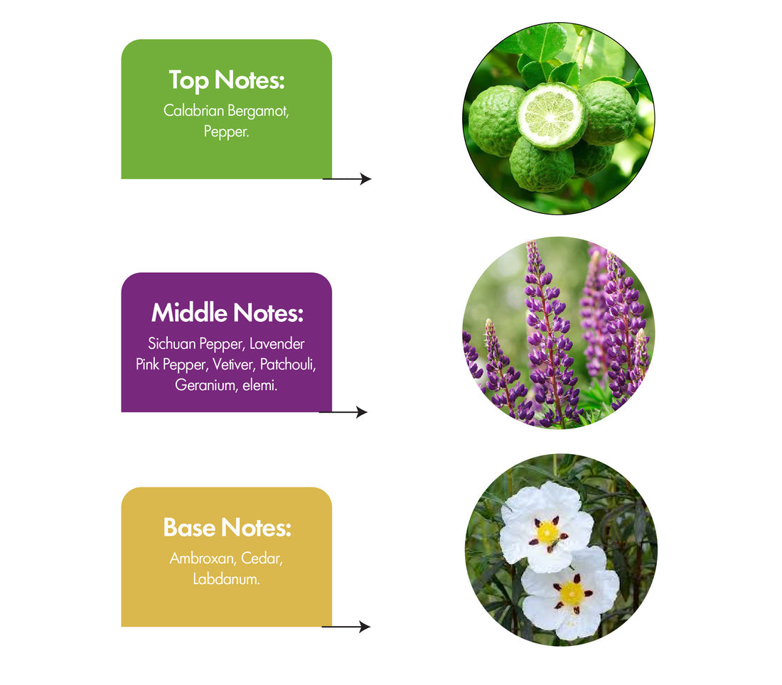 Notes: Bergamot, Sichuan Pepper, Lavender, Geranium, Elemi Resin, Patchouli, Ambroxan, Vanilla